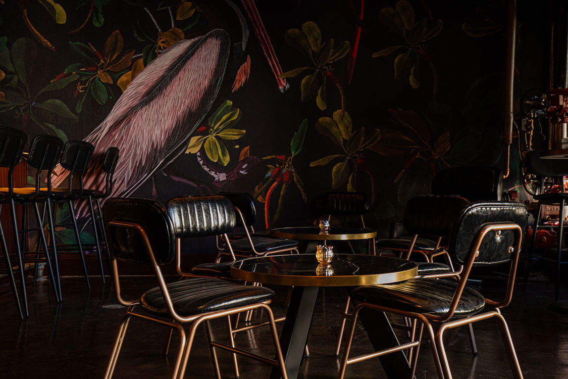 Both the restaurant and event space open up to a tranquil, 2,000-square-foot patio, featuring lush bamboo stands and sweeping views of the historic St. Patrick’s Church bell tower. The space seamlessly blends elements of nature and music and is richly adorned with wallpaper artist Olga Mulica's striking Night Pelican mural and Harney and Sons floral wallpaper, while the warm patina of exposed brick highlights the building's storied past, creating an atmosphere of refined charm and timeless elegance.